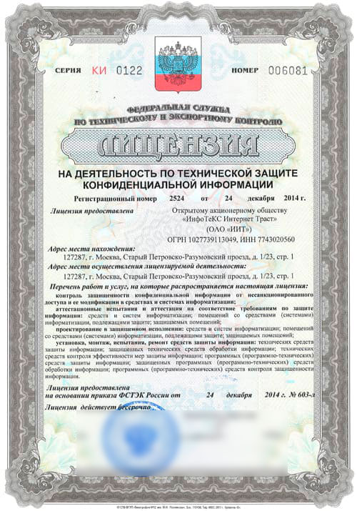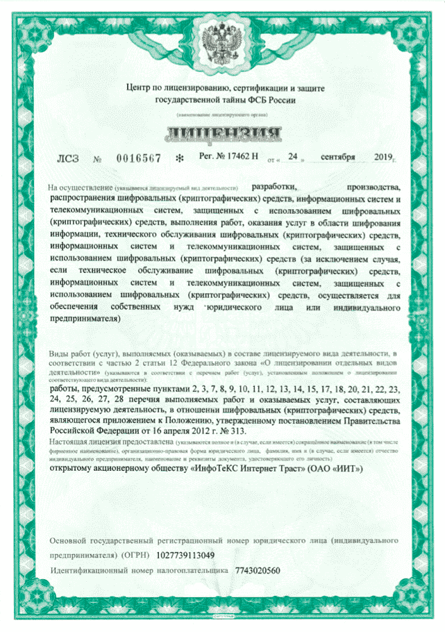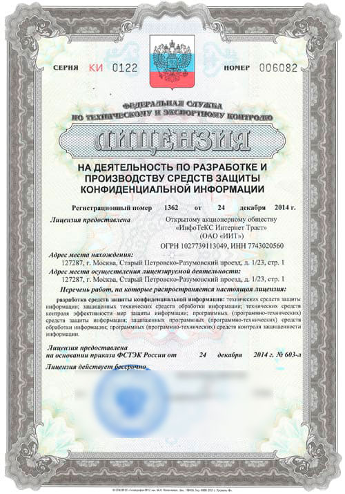 «Инфотекс Интернет Траст» входит в список крупнейших удостоверяющих центров России, аккредитованных по новым требованиям №63-ФЗ от 2021 года. Мы также оказываем услуги оператора юридически значимого электронного документооборота и сдачи электронной отчётности. Все созданные нами решения имеют лицензии ФСТЭК, ФСБ, Минцифры и других ведомств.
